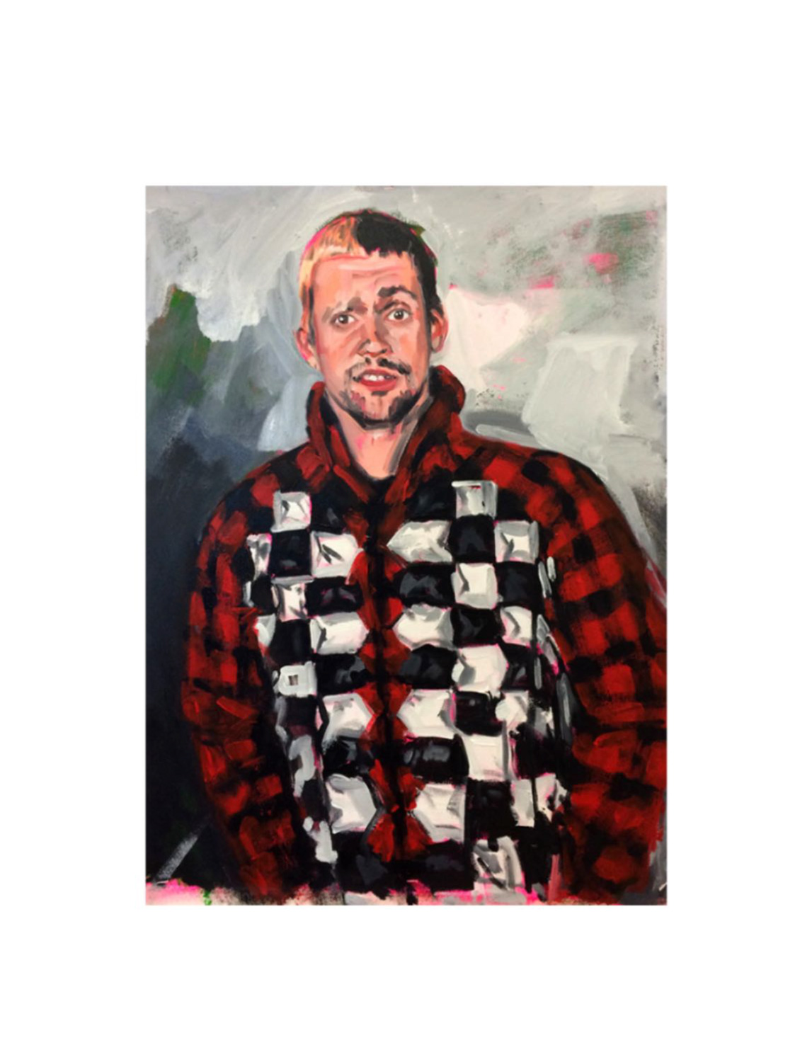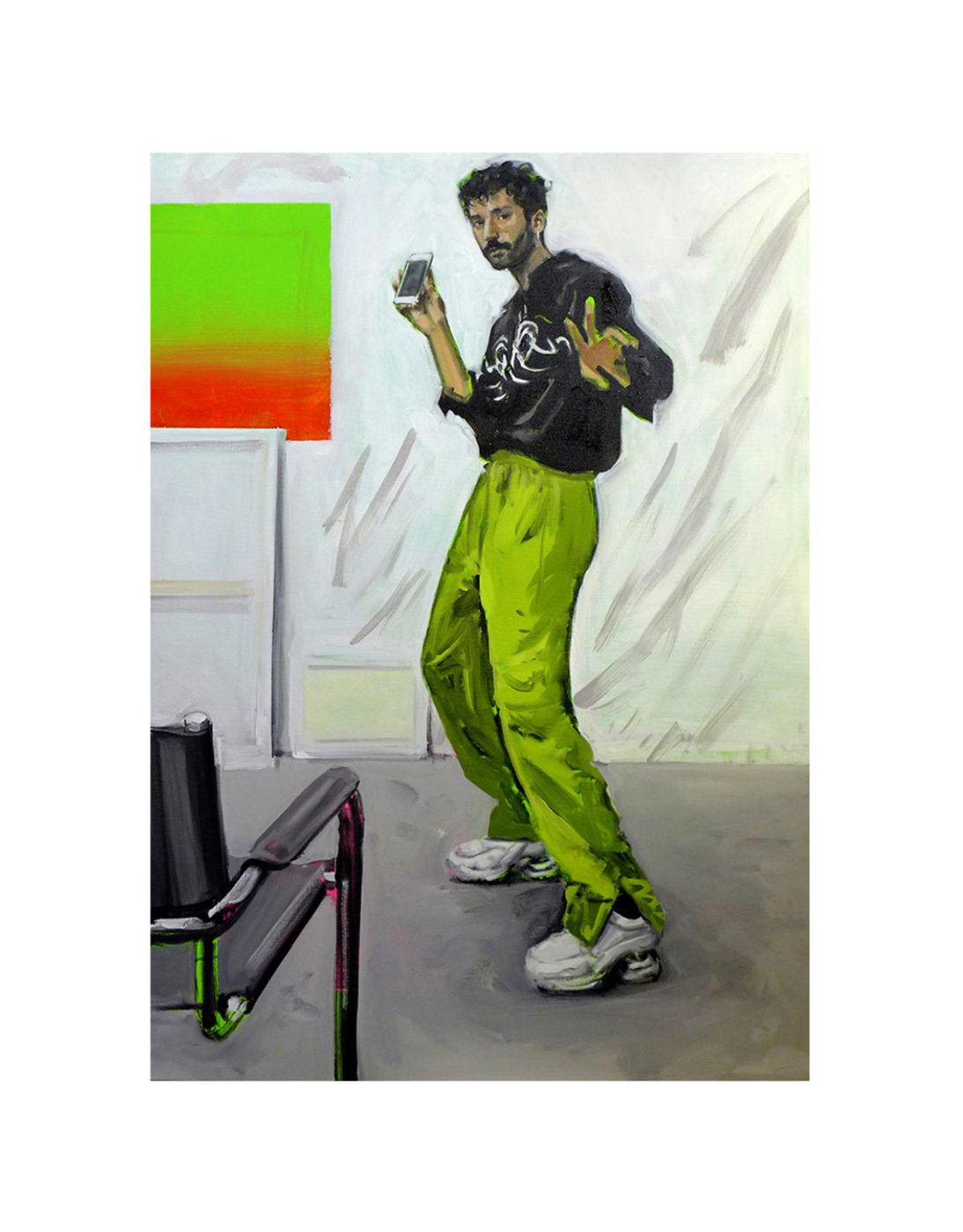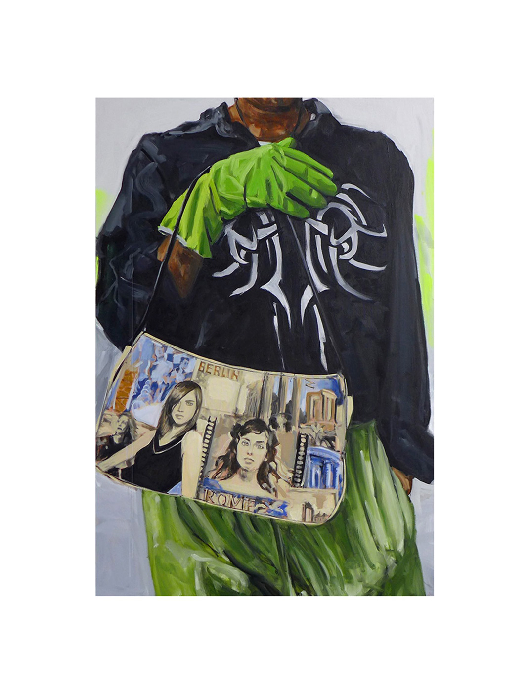 Retratos realizados en Alemania, encuentros en la Costa de Sol, momentos en el Pimpi Florida de su residencia en Málaga durante tres años, compañeros de residencias artísticas en diversos puntos europeos conviven con una fusión del encuentro entre la cultura francesa y la española en las que la artista ironiza sobre estereotipos de ambos para, precisamente, destruirlos y su importancia. No sólo encontramos fragmentos y recortes en algunas de las composiciones expuestas; hay intervención sobre el denim, el textil, el cuero o pequeñas alfombras de pelo sintético, algunas de ellas participantes en una performance en la Fashion Week de Paris hace algunos años.